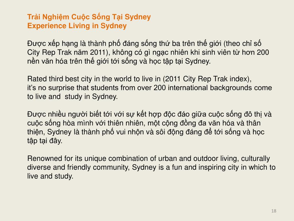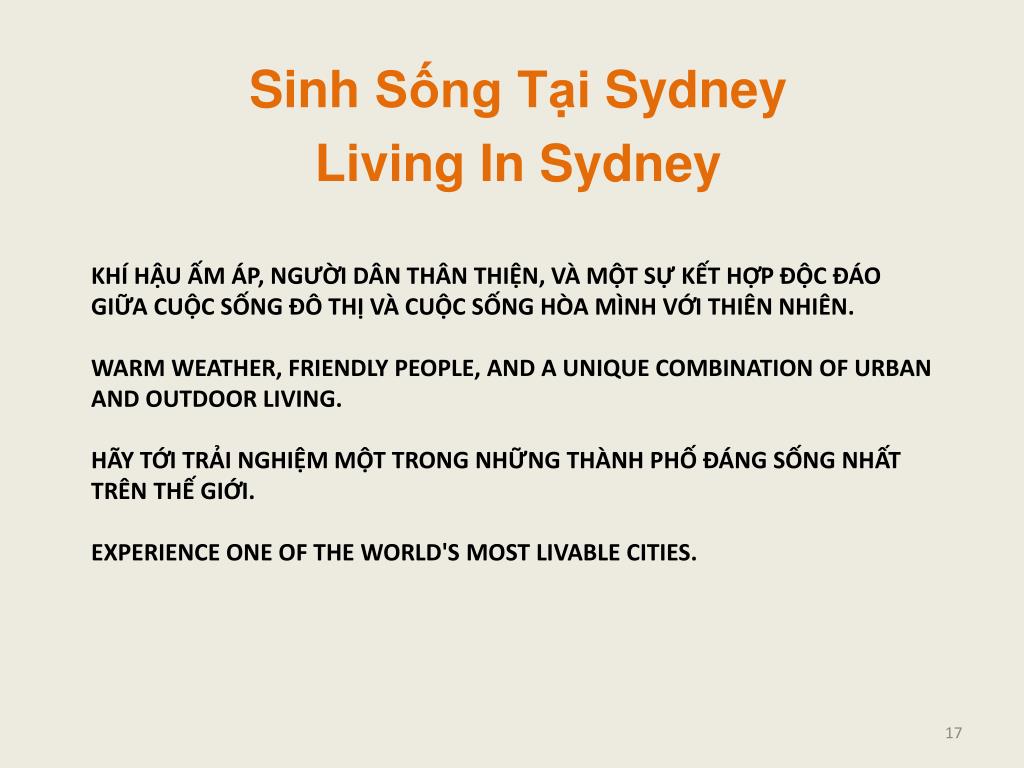 SinhSốngTại Sydney Living In Sydney Khíhậuấmáp, ngườidânthânthiện, vàmộtsựkếthợpđộcđáogiữacuộcsốngđôthịvàcuộcsốnghòamìnhvớithiênnhiên. Warm weather, friendly people, and a unique combination of urban and outdoor living. Hãytớitrảinghiệmmộttrongnhữngthànhphốđángsốngnhấttrênthếgiới.Experience one of the world's most livable cities.