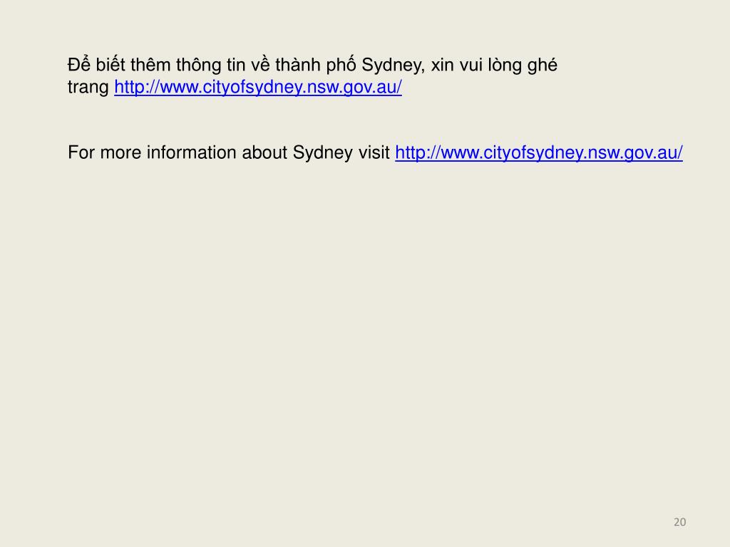 Để biết thêm thông tin về thành phố Sydney, xin vui lòng ghé trang http://www.cityofsydney.nsw.gov.au/ For more information about Sydney visit http://www.cityofsydney.nsw.gov.au/