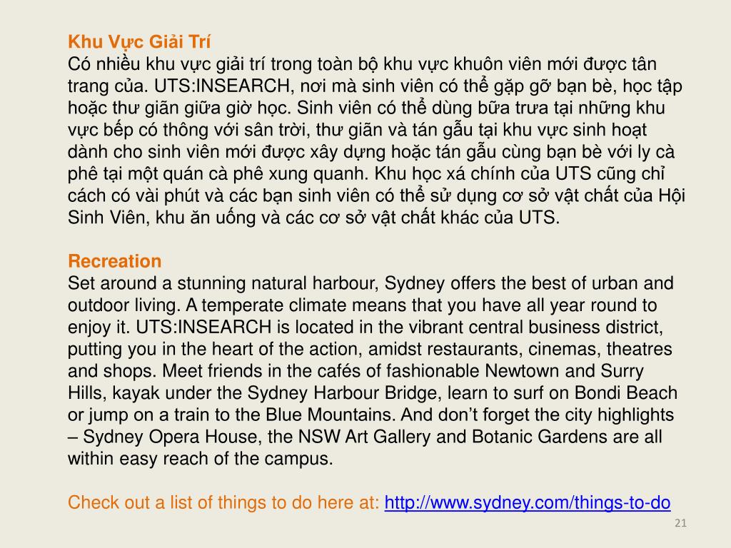 KhuVựcGiảiTrí Cónhiềukhuvựcgiảitrítrongtoànbộkhuvựckhuônviênmớiđượctântrangcủa. UTS:INSEARCH, nơimàsinhviêncóthểgặpgỡbạnbè, họctậphoặcthưgiãngiữagiờhọc. Sinhviêncóthểdùngbữatrưatạinhữngkhuvựcbếpcóthôngvớisântrời, thưgiãnvàtángẫutạikhuvựcsinhhoạtdànhchosinhviênmớiđượcxâydựnghoặctángẫucùngbạnbèvớilycàphêtạimộtquáncàphêxungquanh. Khuhọcxáchínhcủa UTS cũngchỉcáchcóvàiphútvàcácbạnsinhviêncóthểsửdụngcơsởvậtchấtcủaHộiSinhViên, khuănuốngvàcáccơsởvậtchấtkháccủa UTS. Recreation Set around a stunning natural harbour, Sydney offers the best of urban and outdoor living. A temperate climate means that you have all year round to enjoy it. UTS:INSEARCH is located in the vibrant central business district, putting you in the heart of the action, amidst restaurants, cinemas, theatres and shops. Meet friends in the cafés of fashionable Newtown and Surry Hills, kayak under the Sydney Harbour Bridge, learn to surf on Bondi Beach or jump on a train to the Blue Mountains. And don’t forget the city highlights – Sydney Opera House, the NSW Art Gallery and Botanic Gardens are all within easy reach of the campus. Check out a list of things to do here at: http://www.sydney.com/things-to-do