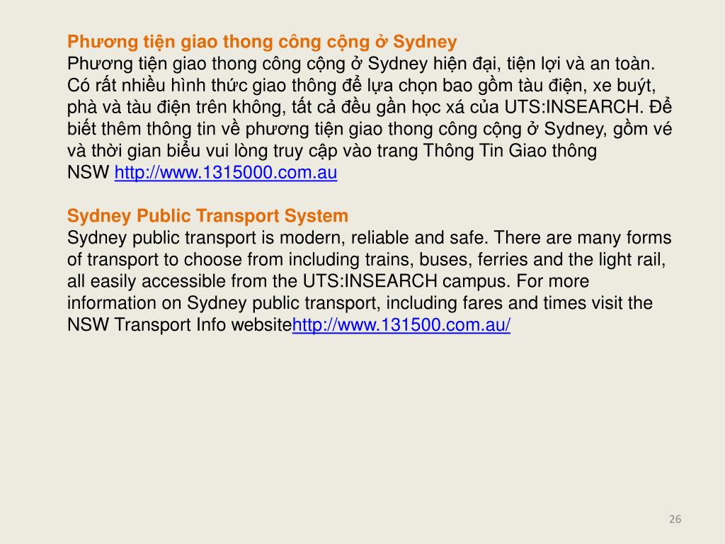 Phươngtiệngiao thong côngcộng ở Sydney Phươngtiệngiao thong côngcộng ở Sydney hiệnđại, tiệnlợivà an toàn. Córấtnhiềuhìnhthứcgiaothôngđểlựachọnbaogồmtàuđiện, xebuýt, phàvàtàuđiệntrênkhông, tấtcảđềugầnhọcxácủa UTS:INSEARCH. Đểbiếtthêmthông tin vềphươngtiệngiao thong côngcộng ở Sydney, gồmvévàthờigianbiểuvuilòngtruycậpvàotrangThông Tin Giaothông NSW http://www.1315000.com.au Sydney Public Transport System Sydney public transport is modern, reliable and safe. There are many forms of transport to choose from including trains, buses, ferries and the light rail, all easily accessible from the UTS:INSEARCH campus. For more information on Sydney public transport, including fares and times visit the NSW Transport Info websitehttp://www.131500.com.au/