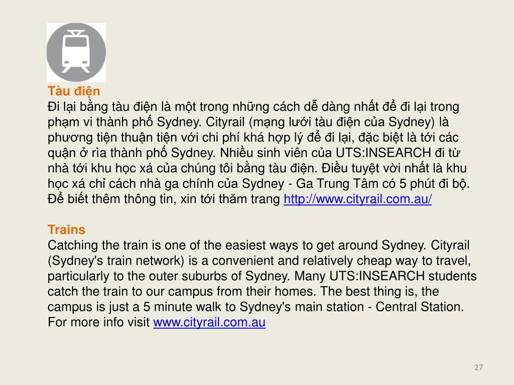 Tàuđiện Đilạibằngtàuđiệnlàmộttrongnhữngcáchdễdàngnhấtđểđilạitrongphạm vi thànhphố Sydney. Cityrail (mạnglướitàuđiệncủa Sydney) làphươngtiệnthuậntiệnvới chi phíkháhợplýđểđilại, đặcbiệtlàtớicácquận ở rìathànhphố Sydney. Nhiềusinhviêncủa UTS:INSEARCH đitừnhàtớikhuhọcxácủachúngtôibằngtàuđiện. Điềutuyệtvờinhấtlàkhuhọcxáchỉcáchnhàgachínhcủa Sydney - GaTrungTâmcó 5 phútđibộ. Đểbiếtthêmthông tin, xintớithămtranghttp://www.cityrail.com.au/ Trains Catching the train is one of the easiest ways to get around Sydney. Cityrail (Sydney's train network) is a convenient and relatively cheap way to travel, particularly to the outer suburbs of Sydney. Many UTS:INSEARCH students catch the train to our campus from their homes. The best thing is, the campus is just a 5 minute walk to Sydney's main station - Central Station. For more info visit www.cityrail.com.au