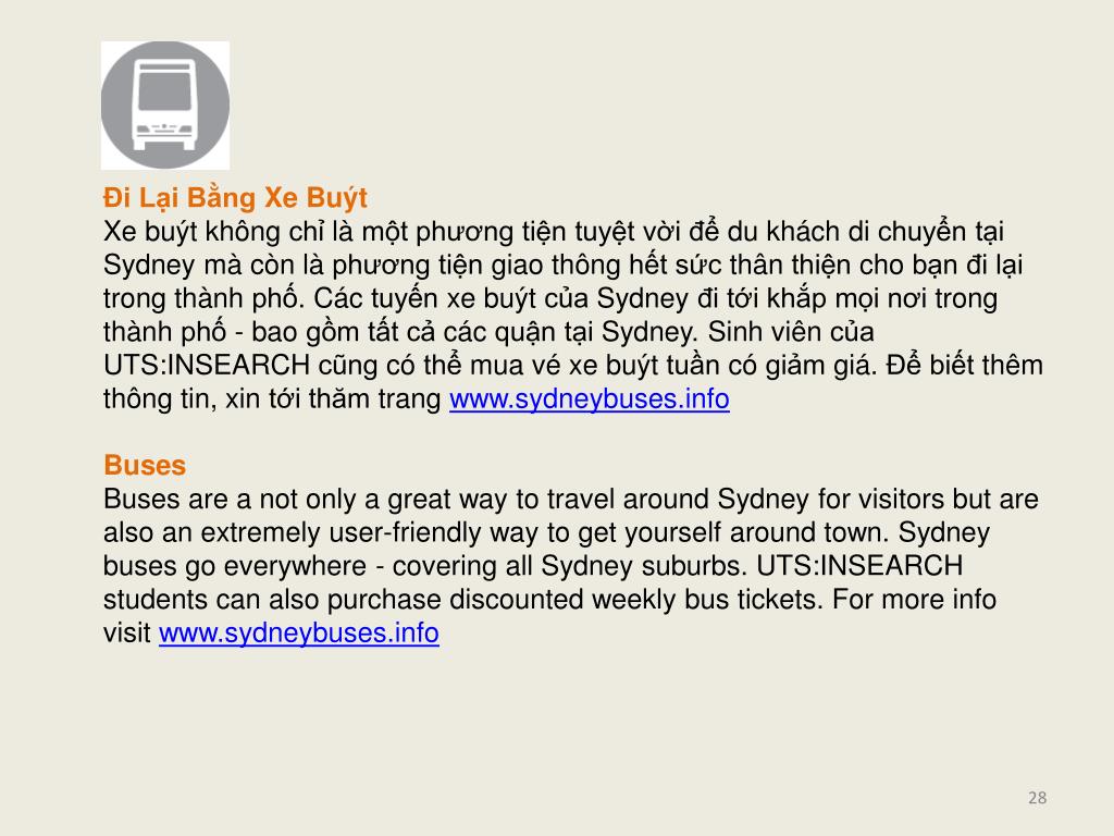 ĐiLạiBằngXeBuýt Xebuýtkhôngchỉlàmộtphươngtiệntuyệtvờiđể du kháchdichuyểntại Sydney màcònlàphươngtiệngiaothônghếtsứcthânthiệnchobạnđilạitrongthànhphố. Cáctuyếnxebuýtcủa Sydney đitớikhắpmọinơitrongthànhphố - baogồmtấtcảcácquậntại Sydney. Sinhviêncủa UTS:INSEARCH cũngcóthểmuavéxebuýttuầncógiảmgiá. Đểbiếtthêmthông tin, xintớithămtrangwww.sydneybuses.info Buses Buses are a not only a great way to travel around Sydney for visitors but are also an extremely user-friendly way to get yourself around town. Sydney buses go everywhere - covering all Sydney suburbs. UTS:INSEARCH students can also purchase discounted weekly bus tickets. For more info visit www.sydneybuses.info