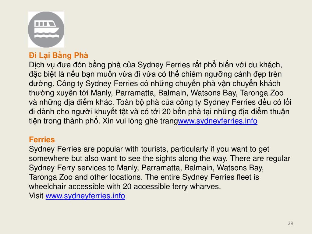 ĐiLạiBằngPhà Dịchvụđưađónbằngphàcủa Sydney Ferries rấtphổbiếnvới du khách, đặcbiệtlànếubạnmuốnvừađivừacóthểchiêmngưỡngcảnhđẹptrênđường. Côngty Sydney Ferries cónhữngchuyếnphàvậnchuyểnkháchthườngxuyêntới Manly, Parramatta, Balmain, Watsons Bay, Taronga Zoo vànhữngđịađiểmkhác. Toànbộphàcủacôngty Sydney Ferries đềucólốiđidànhchongườikhuyếttậtvàcótới 20 bếnphàtạinhữngđịađiểmthuậntiệntrongthànhphố. Xinvuilòngghé trangwww.sydneyferries.info Ferries Sydney Ferries are popular with tourists, particularly if you want to get somewhere but also want to see the sights along the way. There are regular Sydney Ferry services to Manly, Parramatta, Balmain, Watsons Bay, Taronga Zoo and other locations. The entire Sydney Ferries fleet is wheelchair accessible with 20 accessible ferry wharves. Visit www.sydneyferries.info