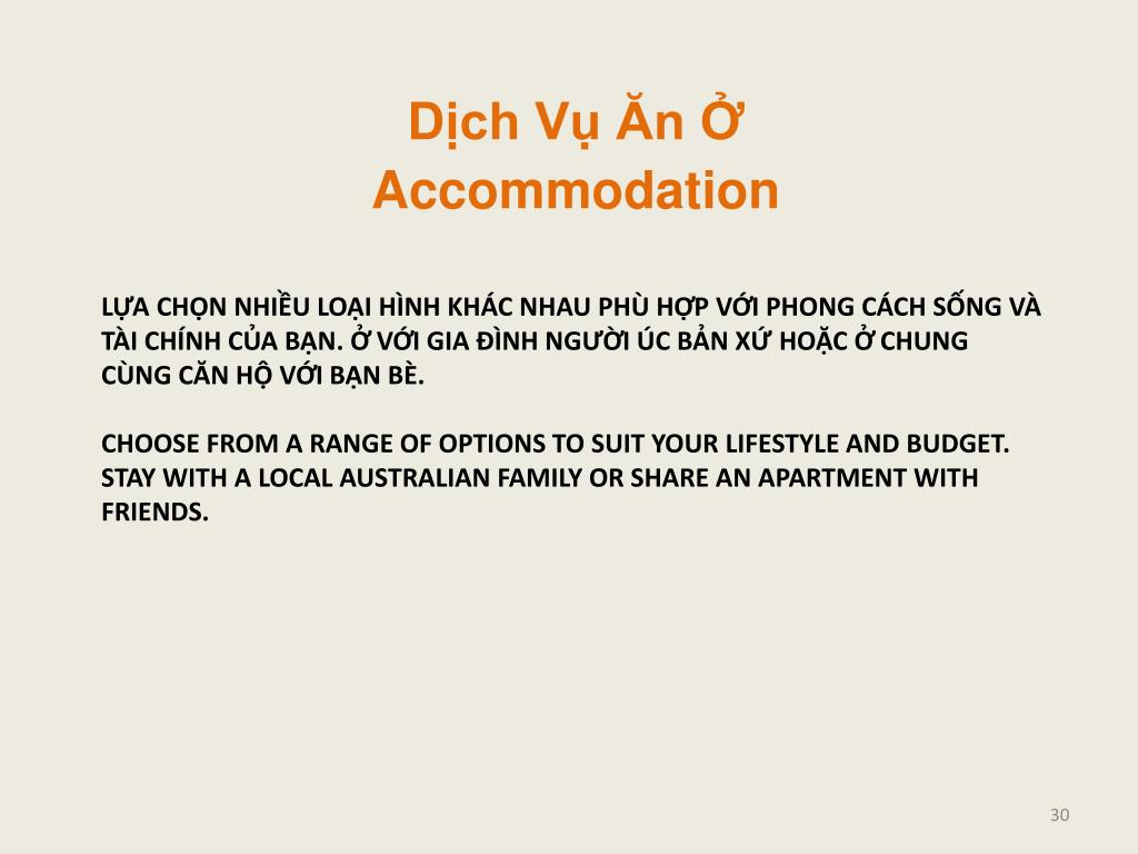 DịchVụĂn Ở Accommodation Lựachọnnhiềuloạihìnhkhácnhauphùhợpvớiphongcáchsốngvàtàichínhcủabạn. Ở vớigiađìnhngườiÚcbảnxứhoặc ở chungcùngcănhộvớibạnbè.Choose from a range of options to suit your lifestyle and budget. Stay with a local Australian family or share an apartment with friends.