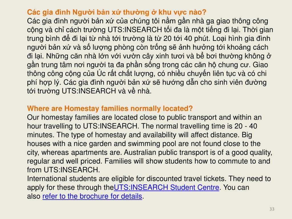 CácgiađìnhNgườibảnxứthường ở khuvựcnào? Cácgiađìnhngườibảnxứcủachúngtôinằmgầnnhàgagiaothôngcôngcộngvàchỉcáchtrường UTS:INSEARCH tốiđalàmộttiếngđilại. Thờigiantrungbìnhđểđilạitừnhàtớitrườnglàtừ 20 tới 40 phút. Loạihìnhgiađìnhngườibảnxứvàsốlượngphòngcòntrốngsẽảnhhưởngtớikhoảngcáchđilại. Nhữngcănnhàlớnvớivườncâyxinhtươivàbểbơithườngkhông ở gầntrungtâmnơingườitađaphầnsốngtrongcáccănhộchungcư. GiaothôngcôngcộngcủaÚcrấtchấtlượng, cónhiềuchuyếnliêntụcvàcó chi phíhợplý. Cácgiađìnhngườibảnxứsẽhướngdẫnchosinhviênđườngtớitrường UTS:INSEARCH vàvềnhà. Where are Homestay families normally located? Our homestay families are located close to public transport and within an hour travelling to UTS:INSEARCH. The normal travelling time is 20 - 40 minutes. The type of homestay and availability will affect distance. Big houses with a nice garden and swimming pool are not found close to the city, whereas apartments are. Australian public transport is of a good quality, regular and well priced. Families will show students how to commute to and from UTS:INSEARCH. International students are eligible for discounted travel tickets. They need to apply for these through theUTS:INSEARCH Student Centre. You can also refer to the brochure for details.