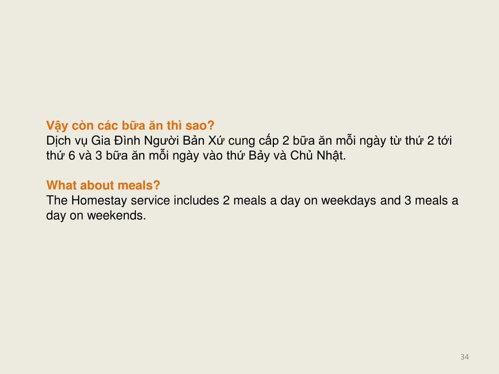 Vậycòncácbữaănthìsao? DịchvụGiaĐìnhNgườiBảnXứcungcấp 2 bữaănmỗingàytừthứ 2 tớithứ 6 và 3 bữaănmỗingàyvàothứBảyvàChủNhật. What about meals? The Homestay service includes 2 meals a day on weekdays and 3 meals a day on weekends.