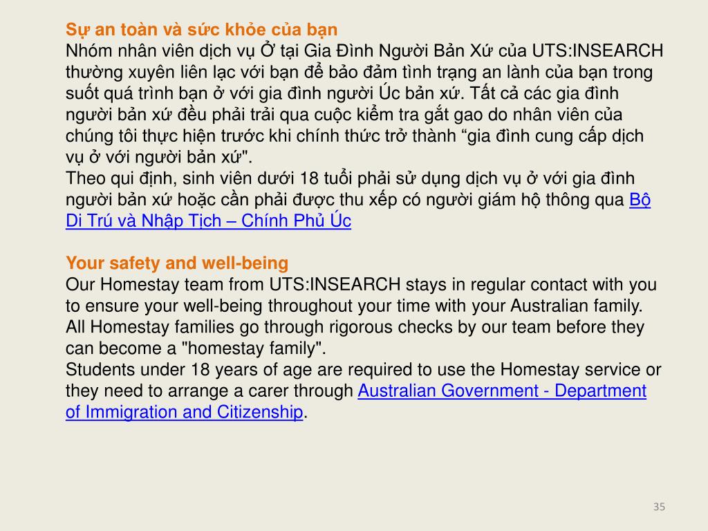 Sự an toànvàsứckhỏecủabạn Nhómnhânviêndịchvụ Ở tạiGiaĐìnhNgườiBảnXứcủa UTS:INSEARCH thườngxuyênliênlạcvớibạnđểbảođảmtìnhtrạng an lànhcủabạntrongsuốtquátrìnhbạn ở vớigiađìnhngườiÚcbảnxứ. Tấtcảcácgiađìnhngườibảnxứđềuphảitrải qua cuộckiểmtragắtgao do nhânviêncủachúngtôithựchiệntrướckhichínhthứctrởthành “giađìnhcungcấpdịchvụ ở vớingườibảnxứ".Theo qui định, sinhviêndưới 18 tuổiphảisửdụngdịchvụ ở vớigiađìnhngườibảnxứhoặccầnphảiđượcthuxếpcóngườigiámhộthông qua Bộ Di TrúvàNhậpTịch – ChínhPhủÚc Your safety and well-being Our Homestay team from UTS:INSEARCH stays in regular contact with you to ensure your well-being throughout your time with your Australian family. All Homestay families go through rigorous checks by our team before they can become a "homestay family".Students under 18 years of age are required to use the Homestay service or they need to arrange a carer through Australian Government - Department of Immigration and Citizenship.
