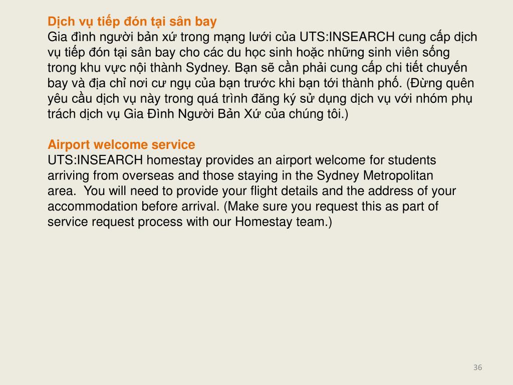 Dịchvụtiếpđóntạisân bay Giađìnhngườibảnxứtrongmạnglướicủa UTS:INSEARCH cungcấpdịchvụtiếpđóntạisân bay chocác du họcsinhhoặcnhữngsinhviênsốngtrongkhuvựcnộithành Sydney. Bạnsẽcầnphảicungcấp chi tiếtchuyến bay vàđịachỉnơicưngụcủabạntrướckhibạntớithànhphố. (ĐừngquênyêucầudịchvụnàytrongquátrìnhđăngkýsửdụngdịchvụvớinhómphụtráchdịchvụGiaĐìnhNgườiBảnXứcủachúngtôi.) Airport welcome service UTS:INSEARCH homestay provides an airport welcome for students arriving from overseas and those staying in the Sydney Metropolitan area. You will need to provide your flight details and the address of your accommodation before arrival. (Make sure you request this as part of service request process with our Homestay team.)