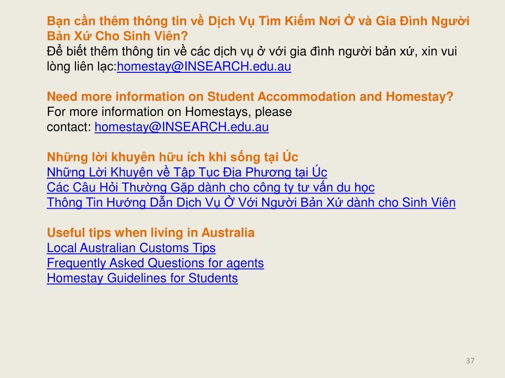 Bạncầnthêmthông tin vềDịchVụTìmKiếmNơi Ở vàGiaĐìnhNgườiBảnXứ Cho SinhViên? Đểbiếtthêmthông tin vềcácdịchvụ ở vớigiađìnhngườibảnxứ, xinvuilòngliênlạc:homestay@INSEARCH.edu.au Need more information on Student Accommodation and Homestay? For more information on Homestays, please contact: homestay@INSEARCH.edu.au NhữnglờikhuyênhữuíchkhisốngtạiÚc NhữngLờiKhuyênvềTậpTụcĐịaPhươngtạiÚc CácCâuHỏiThườngGặpdànhchocôngtytưvấn du học Thông Tin HướngDẫnDịchVụ Ở VớiNgườiBảnXứdànhchoSinhViên Useful tips when living in Australia Local Australian Customs Tips Frequently Asked Questions for agents Homestay Guidelines for Students