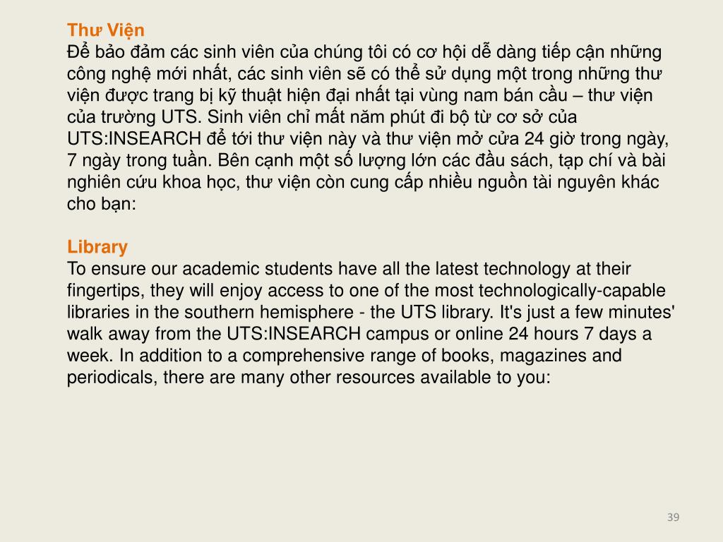 ThưViện Đểbảođảmcácsinhviêncủachúngtôicócơhộidễdàngtiếpcậnnhữngcôngnghệmớinhất, cácsinhviênsẽcóthểsửdụngmộttrongnhữngthưviệnđượctrangbịkỹthuậthiệnđạinhấttạivùngnambáncầu – thưviệncủatrường UTS. Sinhviênchỉmấtnămphútđibộtừcơsởcủa UTS:INSEARCH đểtớithưviệnnàyvàthưviệnmởcửa 24 giờtrongngày, 7 ngàytrongtuần. Bêncạnhmộtsốlượnglớncácđầusách, tạpchívàbàinghiêncứukhoahọc, thưviệncòncungcấpnhiềunguồntàinguyênkhácchobạn: Library To ensure our academic students have all the latest technology at their fingertips, they will enjoy access to one of the most technologically-capable libraries in the southern hemisphere - the UTS library. It's just a few minutes' walk away from the UTS:INSEARCH campus or online 24 hours 7 days a week. In addition to a comprehensive range of books, magazines and periodicals, there are many other resources available to you: