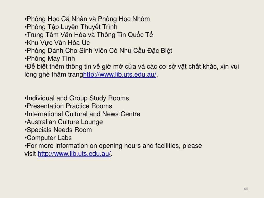 PhòngHọcCáNhânvàPhòngHọcNhóm • PhòngTậpLuyệnThuyếtTrình • TrungTâmVănHóavàThông Tin QuốcTế • KhuVựcVănHóaÚc • PhòngDành Cho SinhViênCó Nhu CầuĐặcBiệt • PhòngMáyTính • Đểbiếtthêmthông tin vềgiờmởcửavàcáccơsởvậtchấtkhác, xinvuilòngghéthăm tranghttp://www.lib.uts.edu.au/. • Individual and Group Study Rooms • Presentation Practice Rooms • International Cultural and News Centre • Australian Culture Lounge • Specials Needs Room • Computer Labs • For more information on opening hours and facilities, please visit http://www.lib.uts.edu.au/.