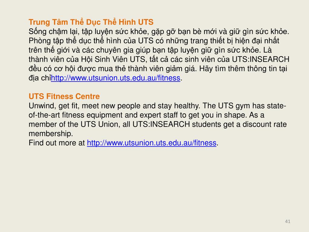 TrungTâmThểDụcThểHình UTS • Sốngchậmlại, tậpluyệnsứckhỏe, gặpgỡbạnbèmớivàgiữgìnsứckhỏe. Phòngtậpthểdụcthểhìnhcủa UTS cónhữngtrangthiếtbịhiệnđạinhấttrênthếgiớivàcácchuyêngiagiúpbạntậpluyệngiữgìnsứckhỏe. LàthànhviêncủaHộiSinhViên UTS, tấtcảcácsinhviêncủa UTS:INSEARCH đềucócơhộiđượcmuathẻthànhviêngiảmgiá. Hãytìmthêmthông tin tạiđịachỉhttp://www.utsunion.uts.edu.au/fitness. • UTS Fitness Centre • Unwind, get fit, meet new people and stay healthy. The UTS gym has state-of-the-art fitness equipment and expert staff to get you in shape. As a member of the UTS Union, all UTS:INSEARCH students get a discount rate membership. Find out more at http://www.utsunion.uts.edu.au/fitness.