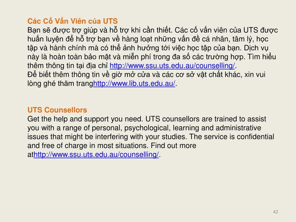 CácCốVấnViêncủa UTS • Bạnsẽđượctrợgiúpvàhỗtrợkhicầnthiết. Cáccốvấnviêncủa UTS đượchuấnluyệnđểhỗtrợbạnvềhàngloạtnhữngvấnđềcánhân, tâmlý, họctậpvàhànhchínhmàcóthểảnhhưởngtớiviệchọctậpcủabạn. Dịchvụnàylàhoàntoànbảomậtvàmiễnphítrongđasốcáctrườnghợp. Tìmhiểuthêmthông tin tạiđịachỉhttp://www.ssu.uts.edu.au/counselling/. • Đểbiếtthêmthông tin vềgiờmởcửavàcáccơsởvậtchấtkhác, xinvuilòngghéthăm tranghttp://www.lib.uts.edu.au/. • UTS Counsellors • Get the help and support you need. UTS counsellors are trained to assist you with a range of personal, psychological, learning and administrative issues that might be interfering with your studies. The service is confidential and free of charge in most situations. Find out more athttp://www.ssu.uts.edu.au/counselling/.