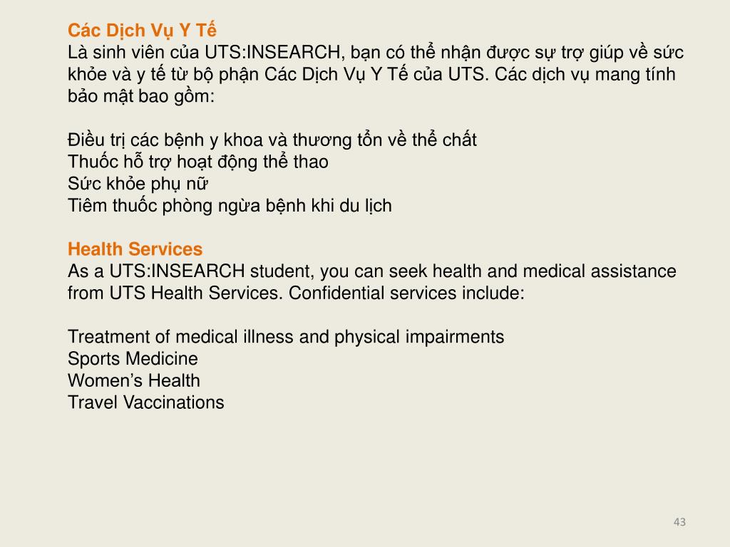 CácDịchVụ Y Tế Làsinhviêncủa UTS:INSEARCH, bạncóthểnhậnđượcsựtrợgiúpvềsứckhỏevà y tếtừbộphậnCácDịchVụ Y Tếcủa UTS. Cácdịchvụmangtínhbảomậtbaogồm: Điềutrịcácbệnh y khoavàthươngtổnvềthểchất Thuốchỗtrợhoạtđộngthểthao Sứckhỏephụnữ Tiêmthuốcphòngngừabệnhkhi du lịch Health Services As a UTS:INSEARCH student, you can seek health and medical assistance from UTS Health Services. Confidential services include: Treatment of medical illness and physical impairments Sports Medicine Women’s Health Travel Vaccinations