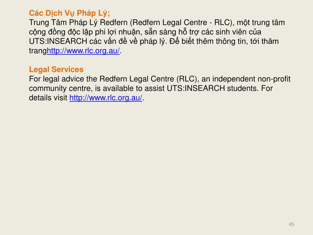 CácDịchVụPhápLý; TrungTâmPhápLýRedfern (Redfern Legal Centre - RLC), mộttrungtâmcộngđồngđộclập phi lợinhuận, sẵnsànghỗtrợcácsinhviêncủa UTS:INSEARCH cácvấnđềvềpháplý. Đểbiếtthêmthông tin, tớithăm tranghttp://www.rlc.org.au/. Legal Services For legal advice the Redfern Legal Centre (RLC), an independent non-profit community centre, is available to assist UTS:INSEARCH students. For details visit http://www.rlc.org.au/.