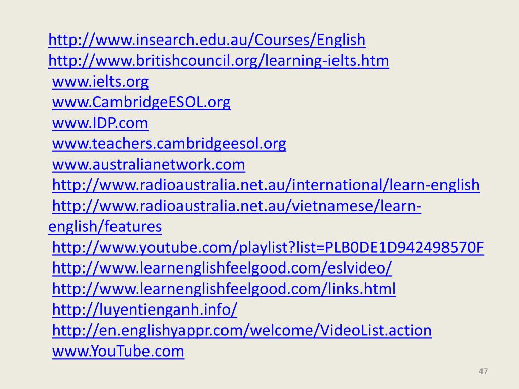 http://www.insearch.edu.au/Courses/English http://www.britishcouncil.org/learning-ielts.htm www.ielts.org www.CambridgeESOL.org www.IDP.com www.teachers.cambridgeesol.org www.australianetwork.com http://www.radioaustralia.net.au/international/learn-english http://www.radioaustralia.net.au/vietnamese/learn-english/features http://www.youtube.com/playlist?list=PLB0DE1D942498570F http://www.learnenglishfeelgood.com/eslvideo/ http://www.learnenglishfeelgood.com/links.html http://luyentienganh.info/ http://en.englishyappr.com/welcome/VideoList.action www.YouTube.com