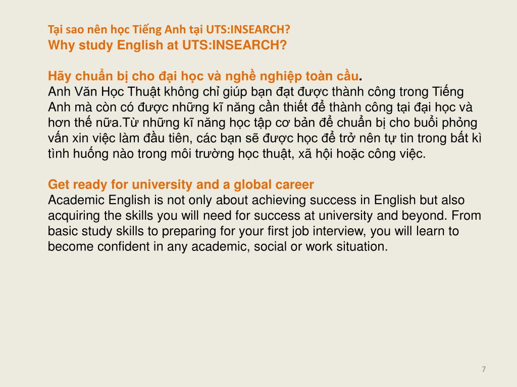 TạisaonênhọcTiếng Anh tại UTS:INSEARCH? Why study English at UTS:INSEARCH? Hãychuẩnbịchođạihọcvànghềnghiệptoàncầu. Anh VănHọcThuậtkhôngchỉgiúpbạnđạtđượcthànhcôngtrongTiếng Anh màcòncóđượcnhữngkĩnăngcầnthiếtđểthànhcôngtạiđạihọcvàhơnthếnữa.Từnhữngkĩnănghọctậpcơbảnđểchuẩnbịchobuổiphỏngvấnxinviệclàmđầutiên, cácbạnsẽđượchọcđểtrởnêntự tin trongbấtkìtìnhhuốngnàotrongmôitrườnghọcthuật, xãhộihoặccôngviệc. Get ready for university and a global career Academic English is not only about achieving success in English but also acquiring the skills you will need for success at university and beyond. From basic study skills to preparing for your first job interview, you will learn to become confident in any academic, social or work situation.