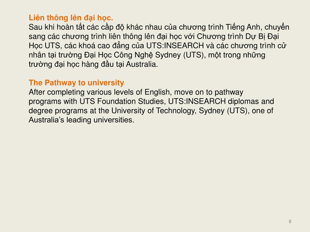 Liênthônglênđạihọc. SaukhihoàntấtcáccầpđộkhácnhaucủachươngtrìnhTiếng Anh, chuyển sang cácchươngtrìnhliênthônglênđạihọcvớiChươngtrìnhDựBịĐạiHọc UTS, cáckhoácaođẳngcủa UTS:INSEARCH vàcácchươngtrìnhcửnhântạitrườngĐạiHọcCôngNghệ Sydney (UTS), mộttrongnhữngtrườngđạihọchàngđầutại Australia. The Pathway to university After completing various levels of English, move on to pathway programs with UTS Foundation Studies, UTS:INSEARCH diplomas and degree programs at the University of Technology, Sydney (UTS), one of Australia’s leading universities.