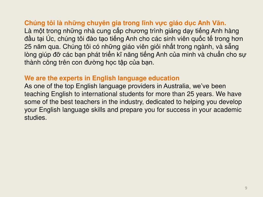 Chúngtôilànhữngchuyêngiatronglĩnhvựcgiáodục Anh Văn. Làmộttrongnhữngnhàcungcấpchươngtrìnhgiảngdạytiếng Anh hàngđầutạiÚc, chúngtôiđàotạotiếng Anh chocácsinhviênquốctếtronghơn 25 năm qua. Chúngtôicónhữnggiáoviêngiỏinhấttrongngành, vàsẵnglònggiúpđỡcácbạnpháttriểnkĩnăngtiếng Anh của minh vàchuẩnchosựthànhcôngtrên con đườnghọctậpcủabạn. We are the experts in English language education As one of the top English language providers in Australia, we’ve been teaching English to international students for more than 25 years. We have some of the best teachers in the industry, dedicated to helping you develop your English language skills and prepare you for success in your academic studies.