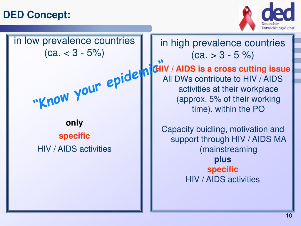 DED Concept: in high prevalence countries (ca. > 3 - 5 %) HIV / AIDS is a cross cutting issue All DWs contribute to HIV / AIDS activities at their workplace (approx. 5% of their working time), within the PO Capacity buidling, motivation and support through HIV / AIDS MA (mainstreaming plus specific HIV / AIDS activities in low prevalence countries (ca. < 3 - 5%) only specific HIV / AIDS activities “Knowyourepidemic“