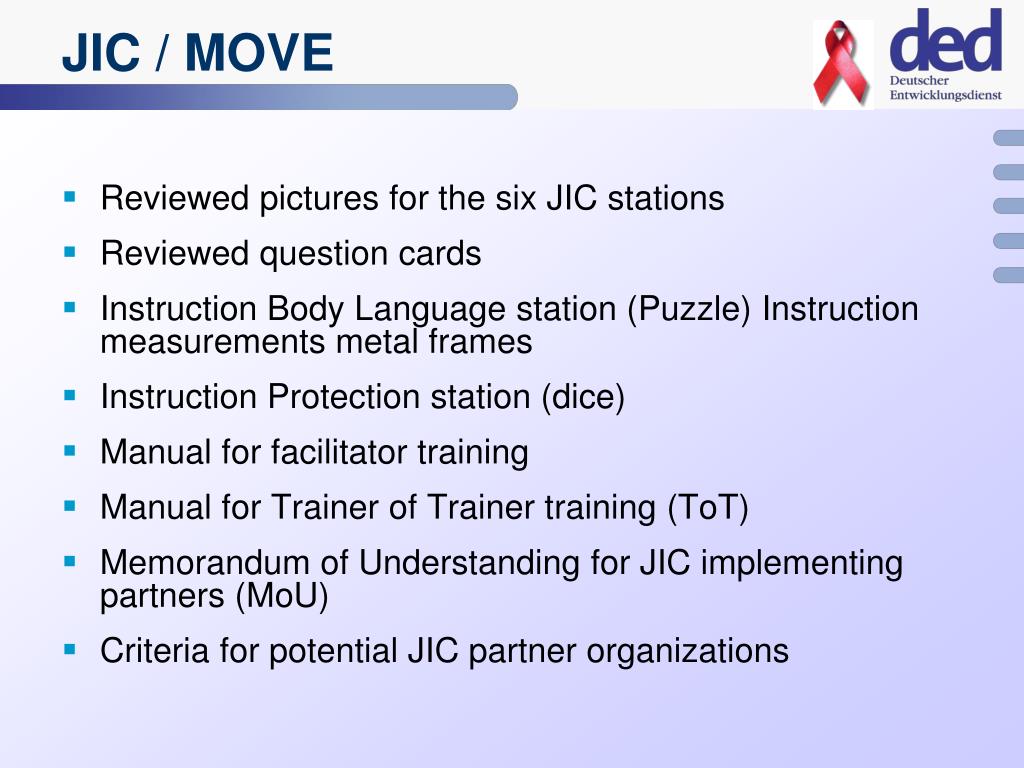 Reviewed pictures for the six JIC stations Reviewed question cards Instruction Body Language station (Puzzle) Instruction measurements metal frames Instruction Protection station (dice) Manual for facilitator training Manual for Trainer of Trainer training (ToT) Memorandum of Understanding for JIC implementing partners (MoU) Criteria for potential JIC partner organizations JIC / MOVE
