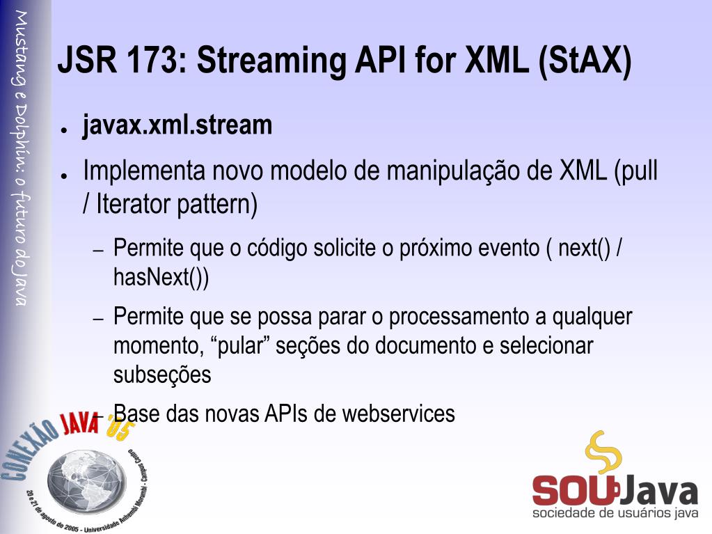 JSR 173: Streaming API for XML (StAX) • javax.xml.stream • Implementa novo modelo de manipulação de XML (pull / Iterator pattern) • Permite que o código solicite o próximo evento ( next() / hasNext()) • Permite que se possa parar o processamento a qualquer momento, “pular” seções do documento e selecionar subseções • Base das novas APIs de webservices