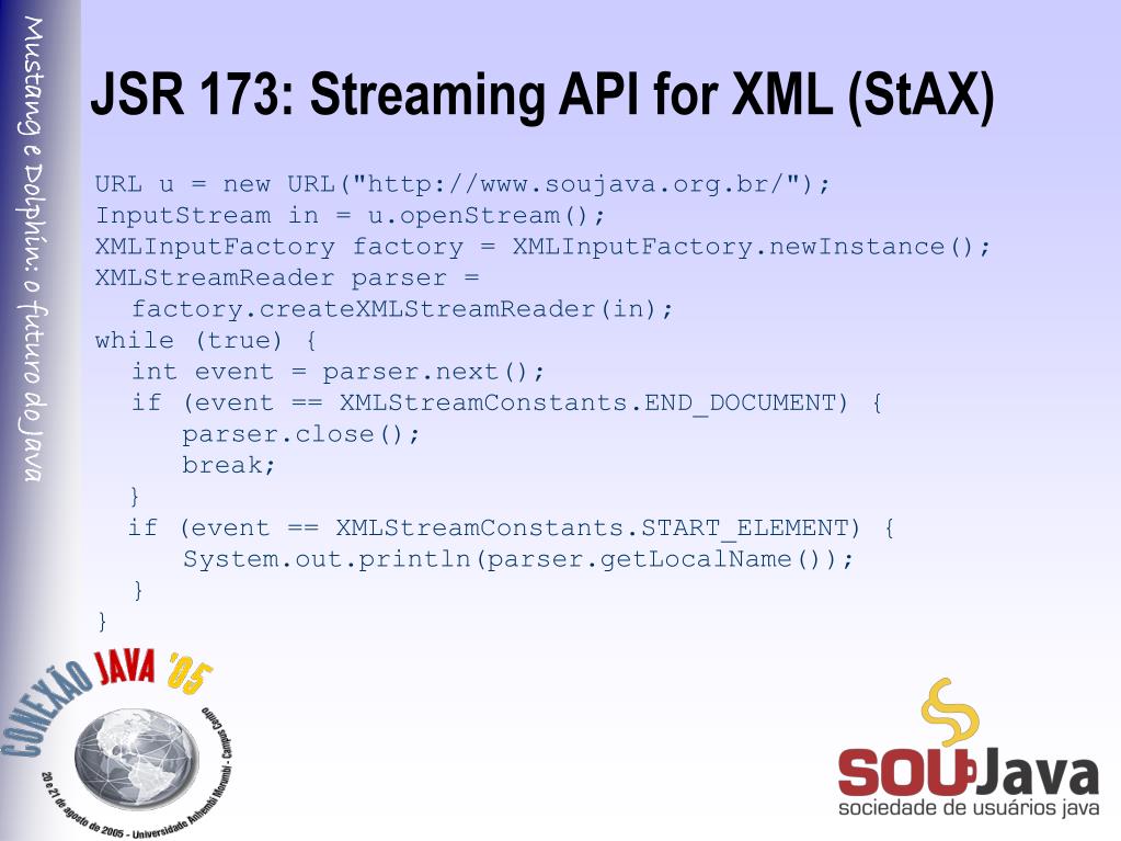 JSR 173: Streaming API for XML (StAX) URL u = new URL("http://www.soujava.org.br/"); InputStream in = u.openStream(); XMLInputFactory factory = XMLInputFactory.newInstance(); XMLStreamReader parser = factory.createXMLStreamReader(in); while (true) { int event = parser.next(); if (event == XMLStreamConstants.END_DOCUMENT) { parser.close(); break; } if (event == XMLStreamConstants.START_ELEMENT) { System.out.println(parser.getLocalName()); } }