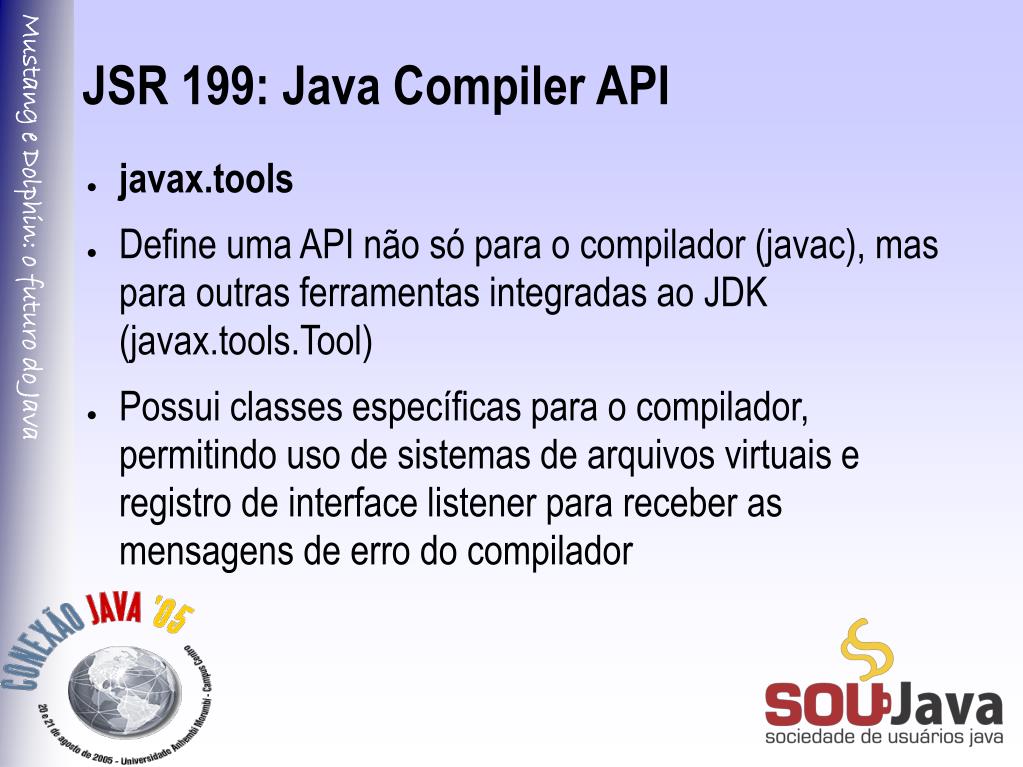 JSR 199: Java Compiler API • javax.tools • Define uma API não só para o compilador (javac), mas para outras ferramentas integradas ao JDK (javax.tools.Tool) • Possui classes específicas para o compilador, permitindo uso de sistemas de arquivos virtuais e registro de interface listener para receber as mensagens de erro do compilador