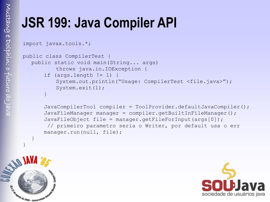 JSR 199: Java Compiler API import javax.tools.*; public class CompilerTest { public static void main(String... args) throws java.io.IOException { if (args.length != 1) { System.out.println(“Usage: CompilerTest <file.java>”); System.exit(1); } JavaCompilerTool compiler = ToolProvider.defaultJavaCompiler(); JavaFileManager manager = compiler.getBuiltInFileManager(); JavaFileObject file = manager.getFileForInput(args[0]); // primeiro parametro seria o Writer, por default usa o err manager.run(null, file); } }
