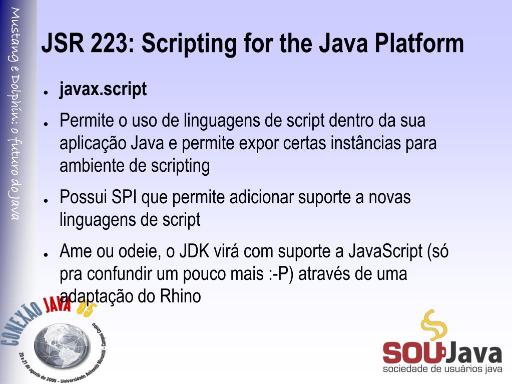 JSR 223: Scripting for the Java Platform • javax.script • Permite o uso de linguagens de script dentro da sua aplicação Java e permite expor certas instâncias para ambiente de scripting • Possui SPI que permite adicionar suporte a novas linguagens de script • Ame ou odeie, o JDK virá com suporte a JavaScript (só pra confundir um pouco mais :-P) através de uma adaptação do Rhino