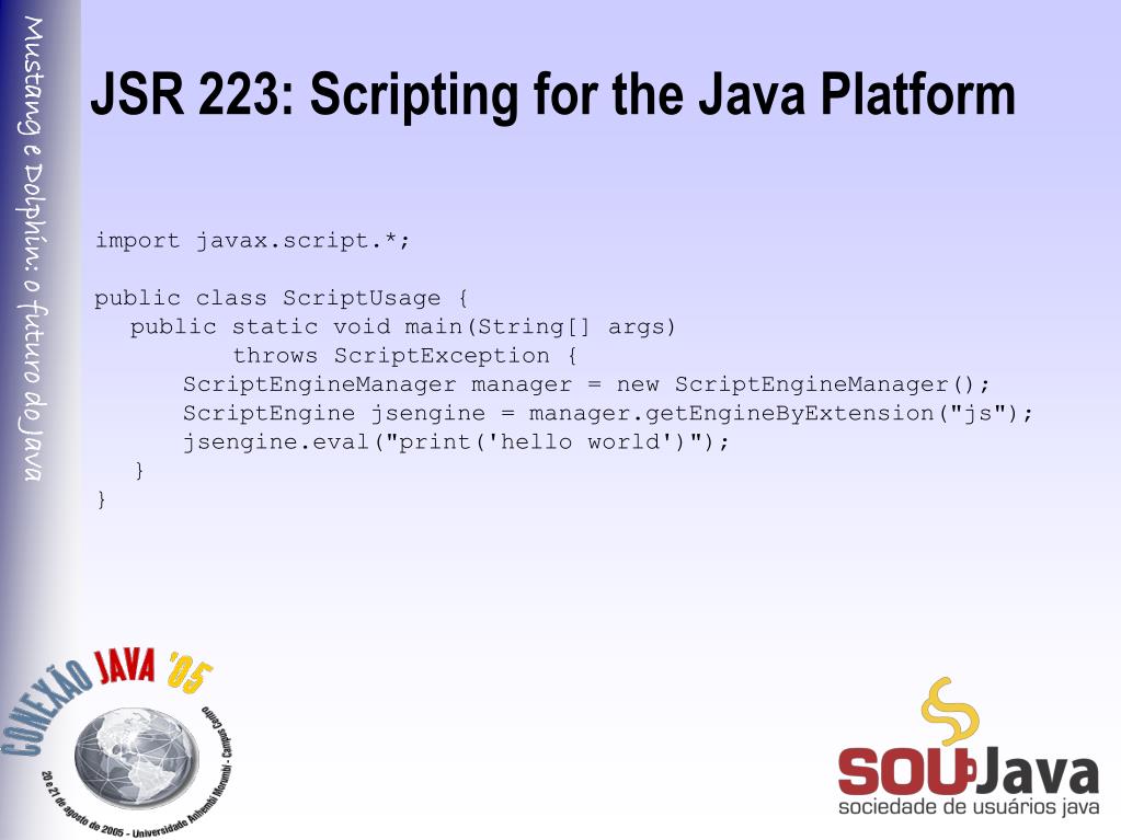JSR 223: Scripting for the Java Platform import javax.script.*; public class ScriptUsage { public static void main(String[] args) throws ScriptException { ScriptEngineManager manager = new ScriptEngineManager(); ScriptEngine jsengine = manager.getEngineByExtension("js"); jsengine.eval("print('hello world')"); } }