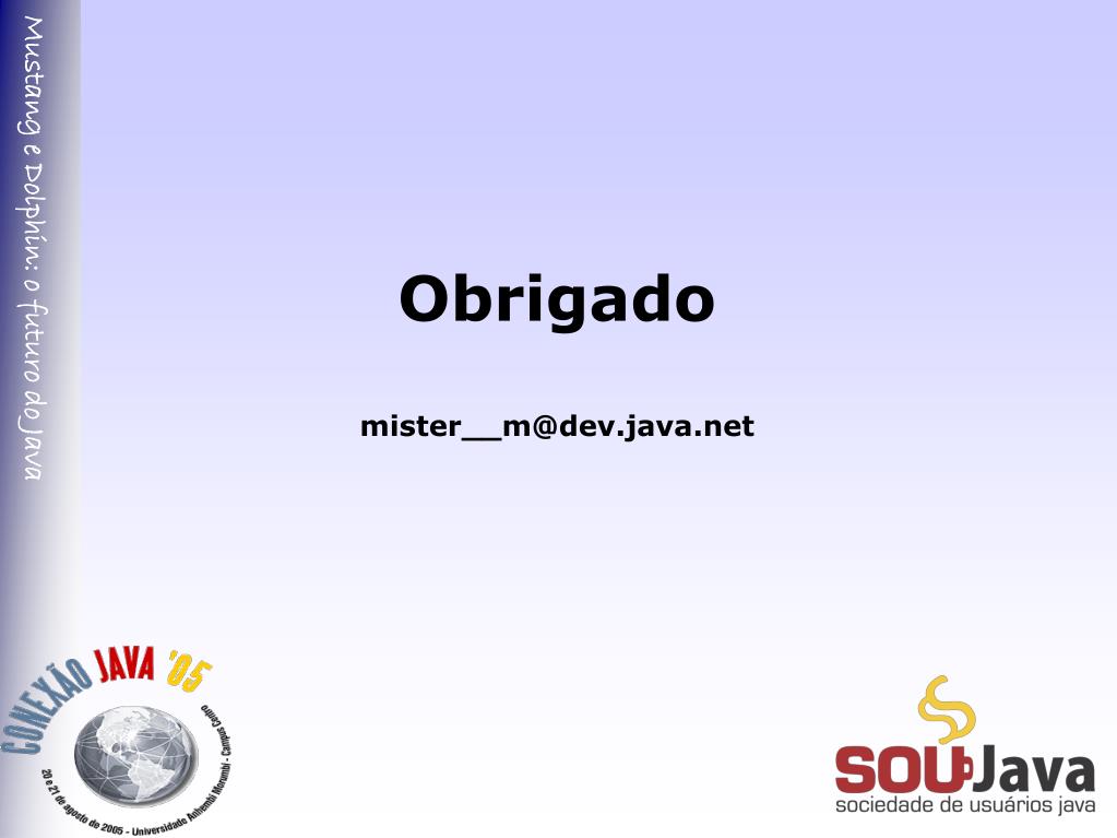 Participe! • Mustang está próximo do “feature freeze” • Ainda há tempo para corrigir bugs e influenciar APIs • Faça download dos builds semanais do Mustang: https://mustang.dev.java.net/ • Leia as especificações que são do seu interesse • Filie-se ao JCP e submeta sua candidatura a JSR do Dolphin quando ela aparecer