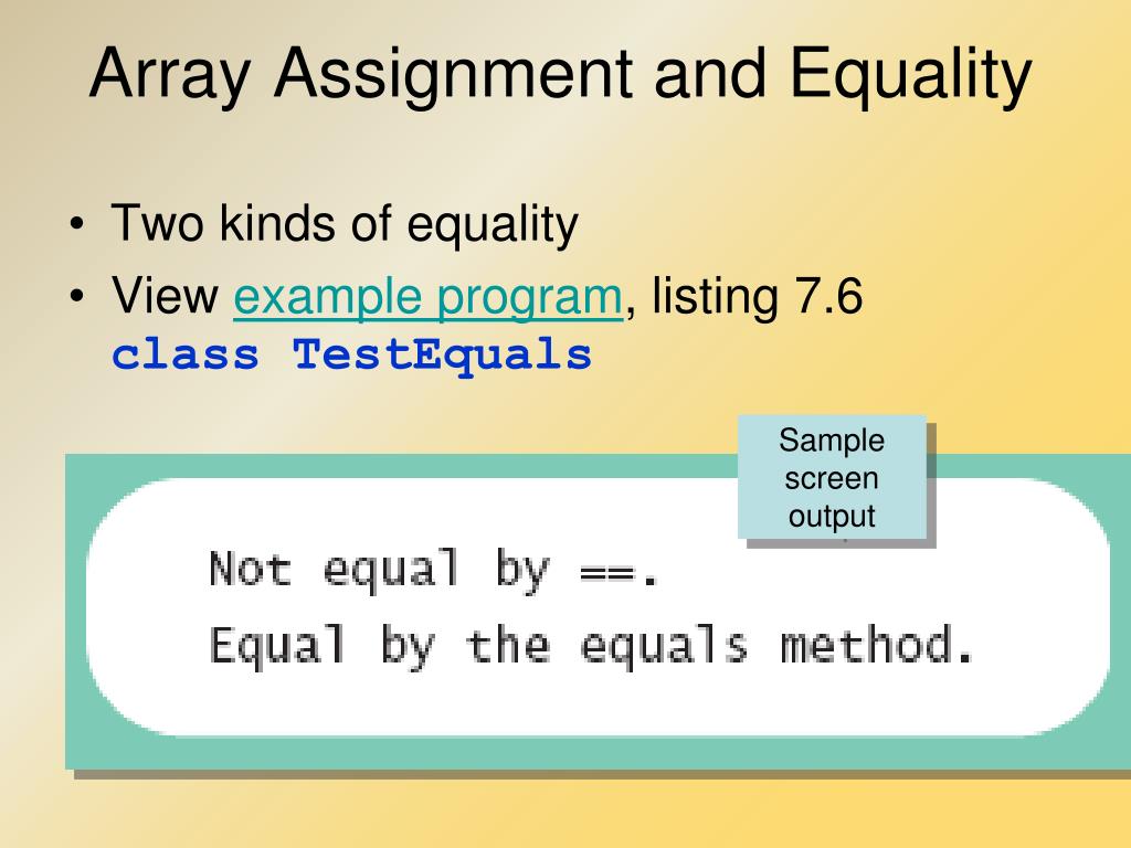 Array Assignment and Equality • Two kinds of equality • View example program, listing 7.6class TestEquals Sample screen output