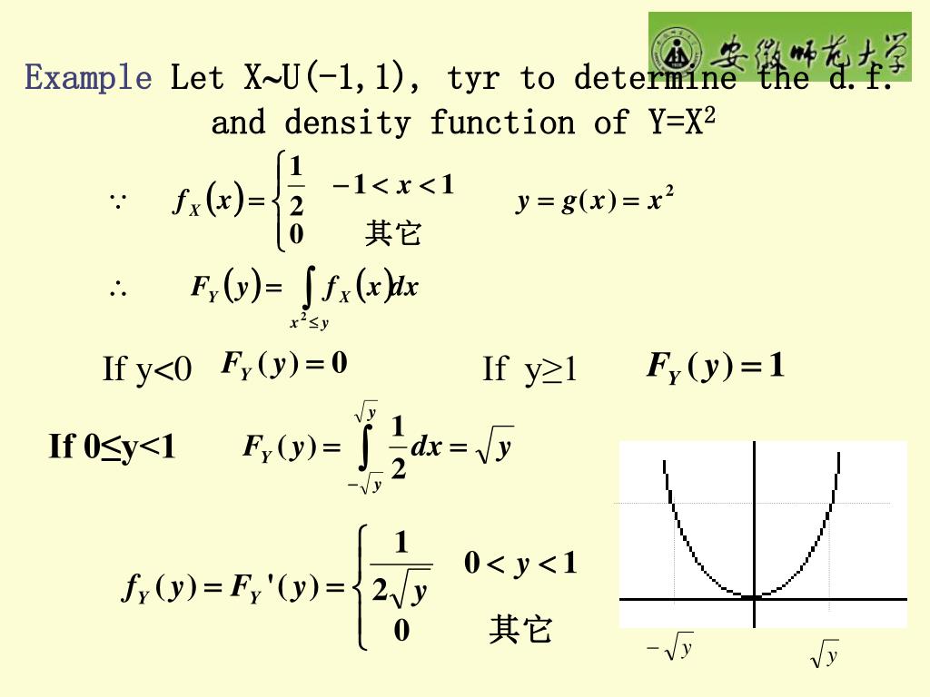 Example Let XU(-1,1), tyr to determine the d.f. and density function of Y=X2 If y<0 If y≥1 If 0≤y<1