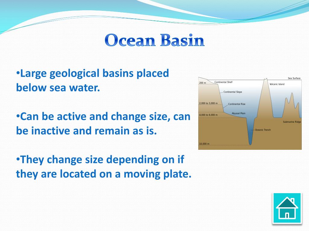 Ocean Basin • Large geological basins placed below sea water. • Can be active and change size, can be inactive and remain as is. • They change size depending on if they are located on a moving plate.