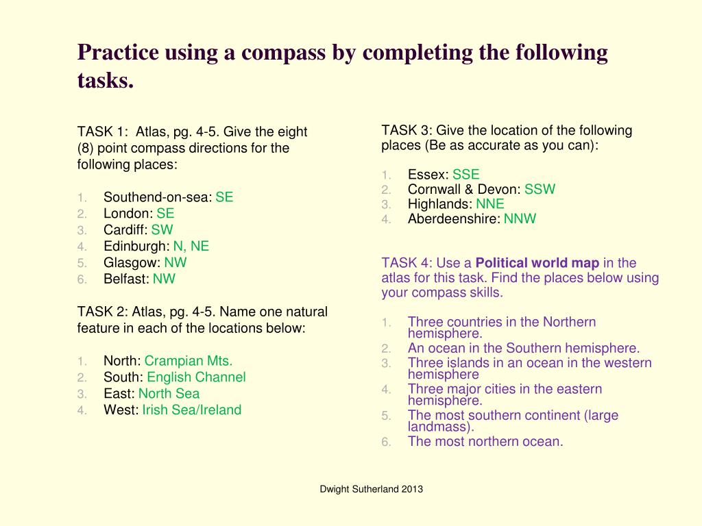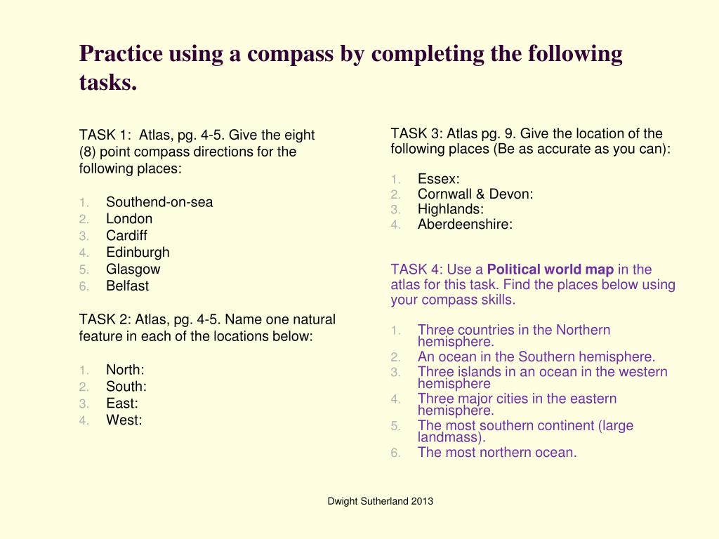 TASK 1: Atlas, pg. 4-5. Give the eight (8) point compass directions for the following places: Southend-on-sea London Cardiff Edinburgh Glasgow Belfast TASK 2: Atlas, pg. 4-5. Name one natural feature in each of the locations below: North: South: East: West: TASK 3: Atlas pg. 9. Give the location of the following places (Be as accurate as you can): Essex: Cornwall & Devon: Highlands: Aberdeenshire: TASK 4: Use a Political world map in the atlas for this task. Find the places below using your compass skills. Three countries in the Northern hemisphere. An ocean in the Southern hemisphere. Three islands in an ocean in the western hemisphere Three major cities in the eastern hemisphere. The most southern continent (large landmass). The most northern ocean. Practice using a compass by completing the following tasks. Dwight Sutherland 2013