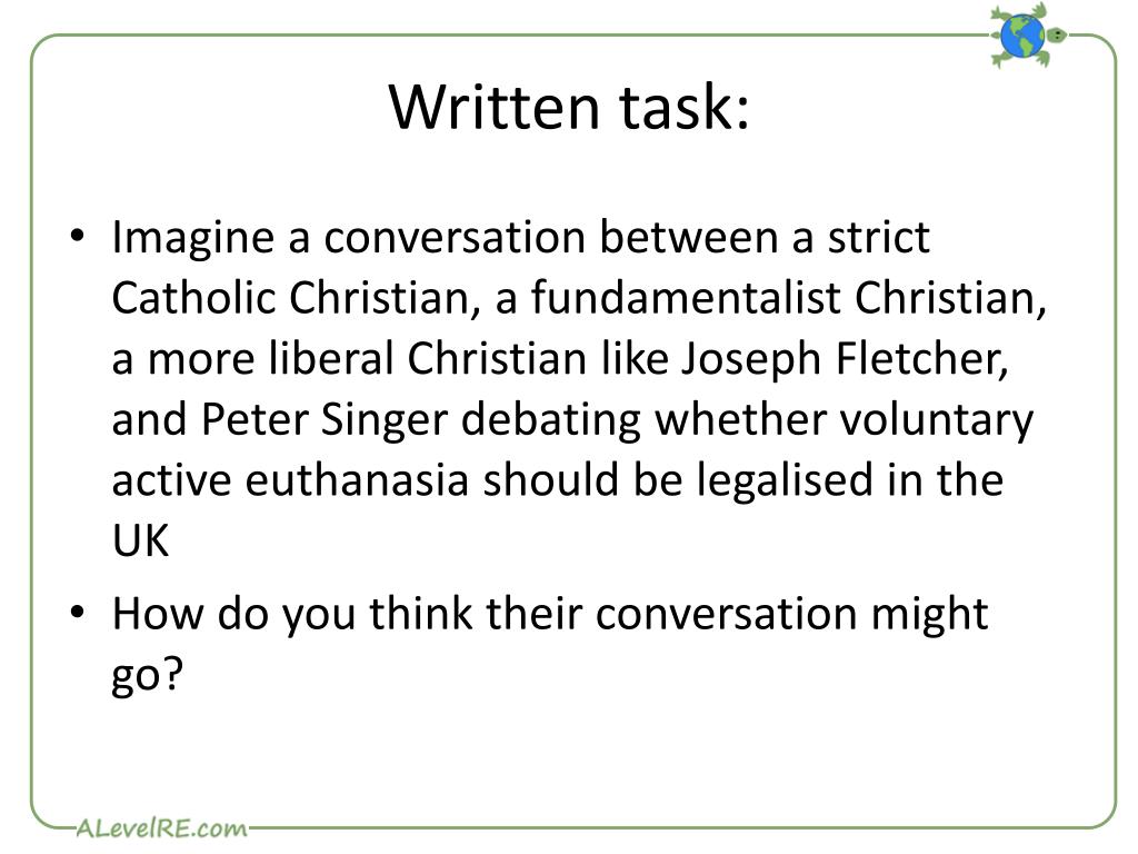 Written task: • Imagine a conversation between a strict Catholic Christian, a fundamentalist Christian, a more liberal Christian like Joseph Fletcher, and Peter Singer debating whether voluntary active euthanasia should be legalised in the UK • How do you think their conversation might go?