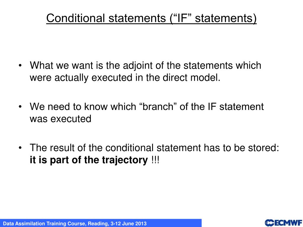 Conditional statements (“IF” statements) What we want is the adjoint of the statements which were actually executed in the direct model. We need to know which “branch” of the IF statement was executed The result of the conditional statement has to be stored: it is part of the trajectory !!!