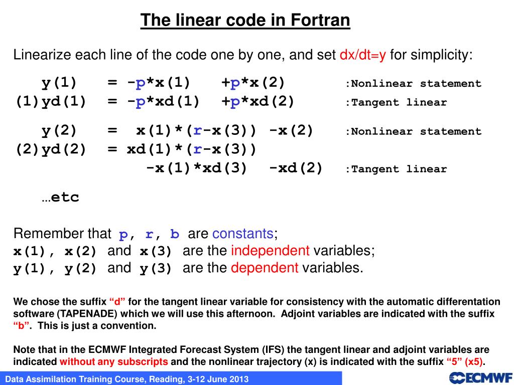 The linear code in Fortran Linearize each line of the code one by one, and set dx/dt=y for simplicity: y(1) = -p*x(1) +p*x(2) :Nonlinear statement (1)yd(1) = -p*xd(1) +p*xd(2) :Tangent linear y(2) = x(1)*(r-x(3)) -x(2) :Nonlinear statement (2)yd(2) = xd(1)*(r-x(3)) -x(1)*xd(3) -xd(2) :Tangent linear …etc Remember that p, r, bare constants; x(1), x(2) and x(3) are the independent variables; y(1), y(2) and y(3) are the dependent variables. We chose the suffix “d” for the tangent linear variable for consistency with the automatic differentation software (TAPENADE) which we will use this afternoon. Adjoint variables are indicated with the suffix “b”. This is just a convention. Note that in the ECMWF Integrated Forecast System (IFS) the tangent linear and adjoint variables are indicated without any subscripts and the nonlinear trajectory (x) is indicated with the suffix “5” (x5).