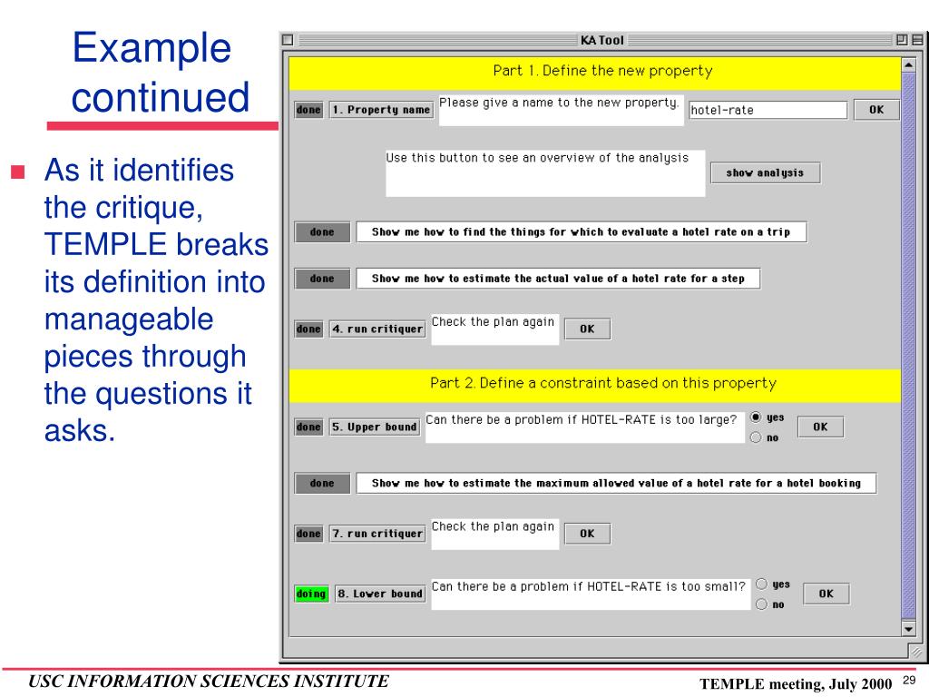 Example continued • As it identifies the critique, TEMPLE breaks its definition into manageable pieces through the questions it asks.