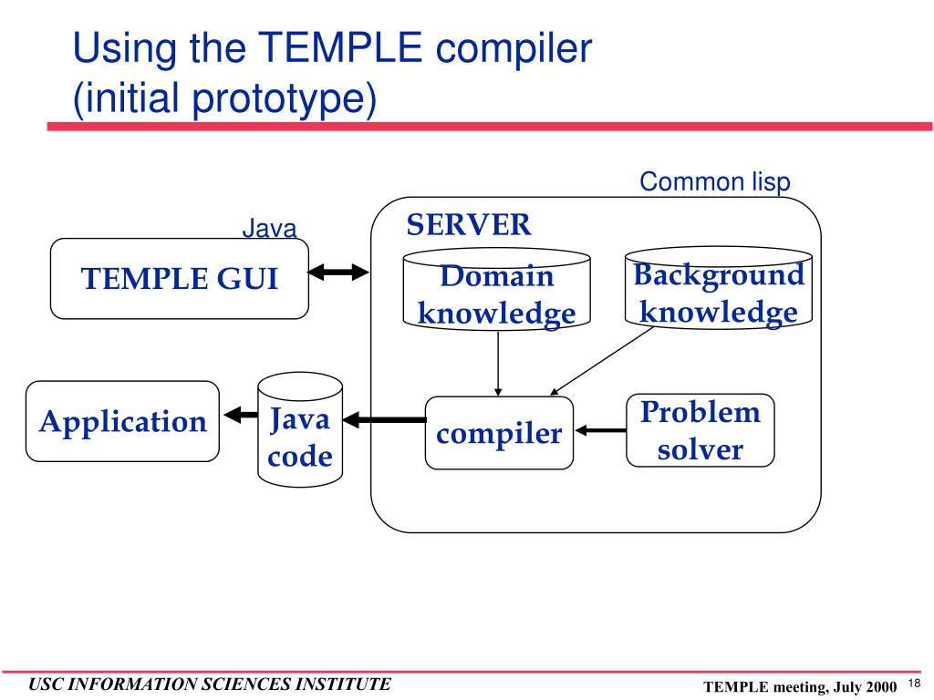 Using the TEMPLE compiler (initial prototype) Common lisp SERVER Java TEMPLE GUI Background knowledge Domain knowledge Java code Application Problem solver compiler