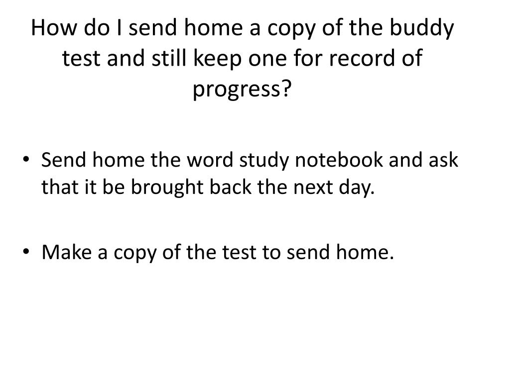 How do I send home a copy of the buddy test and still keep one for record of progress? • Send home the word study notebook and ask that it be brought back the next day. • Make a copy of the test to send home.