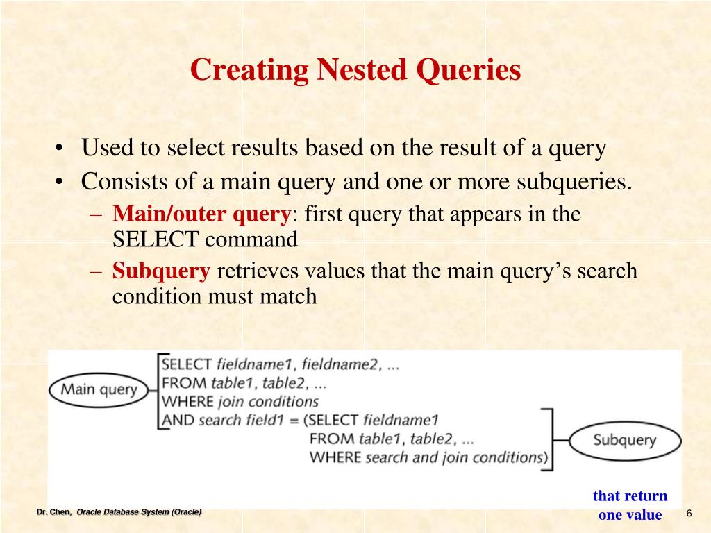 Creating Nested Queries • Used to select results based on the result of a query • Consists of a main query and one or more subqueries. • Main/outer query: first query that appears in the SELECT command • Subqueryretrieves values that the main query’s search condition must match that return one value that return one value