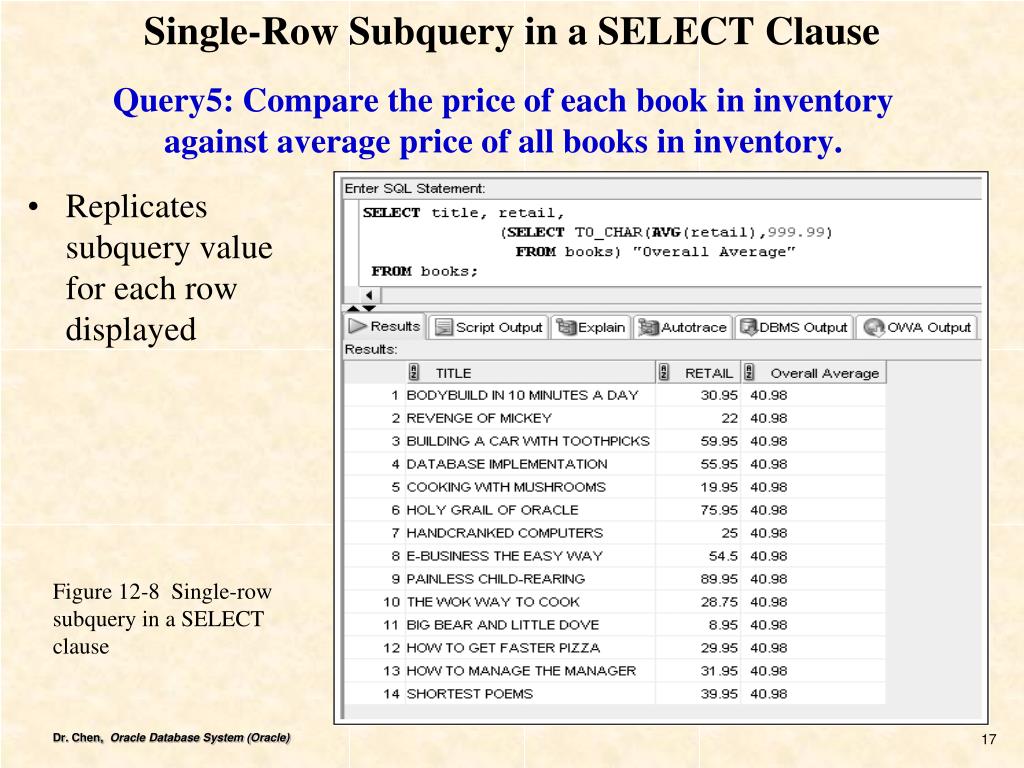 Single-Row Subquery in a SELECT Clause Query5: Compare the price of each book in inventory against average price of all books in inventory. • Replicates subquery value for each row displayed Figure 12-8 Single-row subquery in a SELECT clause