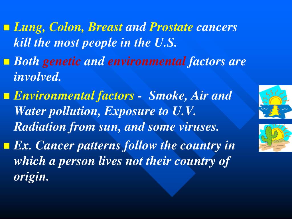 Lung, Colon, Breast and Prostate cancers kill the most people in the U.S. • Both genetic and environmental factors are involved. • Environmental factors - Smoke, Air and Water pollution, Exposure to U.V. Radiation from sun, and some viruses. • Ex. Cancer patterns follow the country in which a person lives not their country of origin.