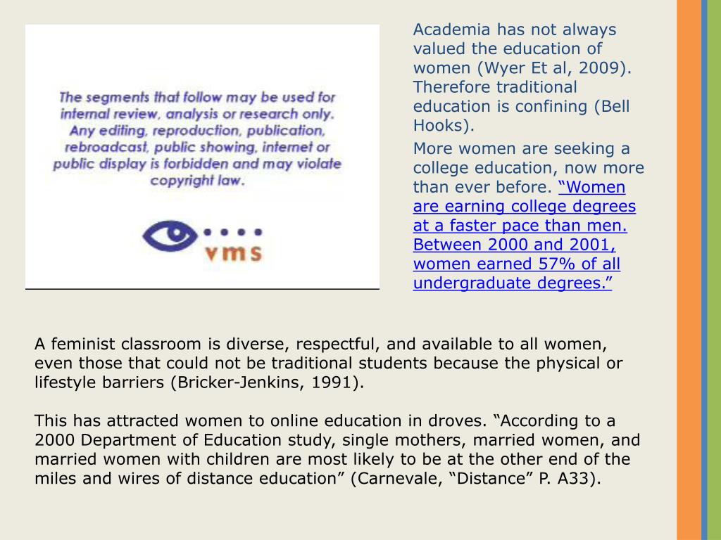 Academia has not always valued the education of women (WyerEt al, 2009). Therefore traditional education is confining (Bell Hooks). More women are seeking a college education, now more than ever before. “Women are earning college degrees at a faster pace than men. Between 2000 and 2001, women earned 57% of all undergraduate degrees.” A feminist classroom is diverse, respectful, and available to all women, even those that could not be traditional students because the physical or lifestyle barriers (Bricker-Jenkins, 1991). This has attracted women to online education in droves. “According to a 2000 Department of Education study, single mothers, married women, and married women with children are most likely to be at the other end of the miles and wires of distance education” (Carnevale, “Distance” P. A33).