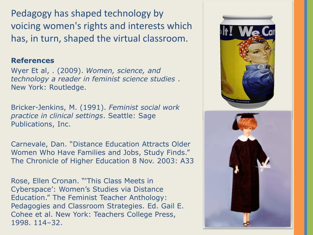 Pedagogy has shaped technology by voicing women's rights and interests which has, in turn, shaped the virtual classroom. References Wyer Et al, . (2009). Women, science, and technology a reader in feminist science studies . New York: Routledge. Bricker-Jenkins, M. (1991). Feminist social work practice in clinical settings. Seattle: Sage Publications, Inc. Carnevale, Dan. “Distance Education Attracts Older Women Who Have Families and Jobs, Study Finds.” The Chronicle of Higher Education 8 Nov. 2003: A33 Rose, Ellen Cronan. “‘This Class Meets in Cyberspace’: Women’s Studies via Distance Education.” The Feminist Teacher Anthology: Pedagogies and Classroom Strategies. Ed. Gail E. Cohee et al. New York: Teachers College Press, 1998. 114–32.