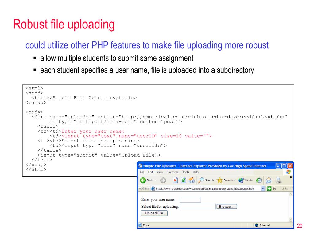 Robust file uploading • could utilize other PHP features to make file uploading more robust • allow multiple students to submit same assignment • each student specifies a user name, file is uploaded into a subdirectory • <html><head> <title>Simple File Uploader</title></head><body> <form name="uploader" action="http://empirical.cs.creighton.edu/~davereed/upload.php" enctype="multipart/form-data" method="post"> <table> <tr><td>Enter your user name: <td><input type="text" name="userID" size=10 value=""> <tr><td>Select file for uploading: <td><input type="file" name="userfile"> </table> <input type="submit" value="Upload File"> </form></body></html>