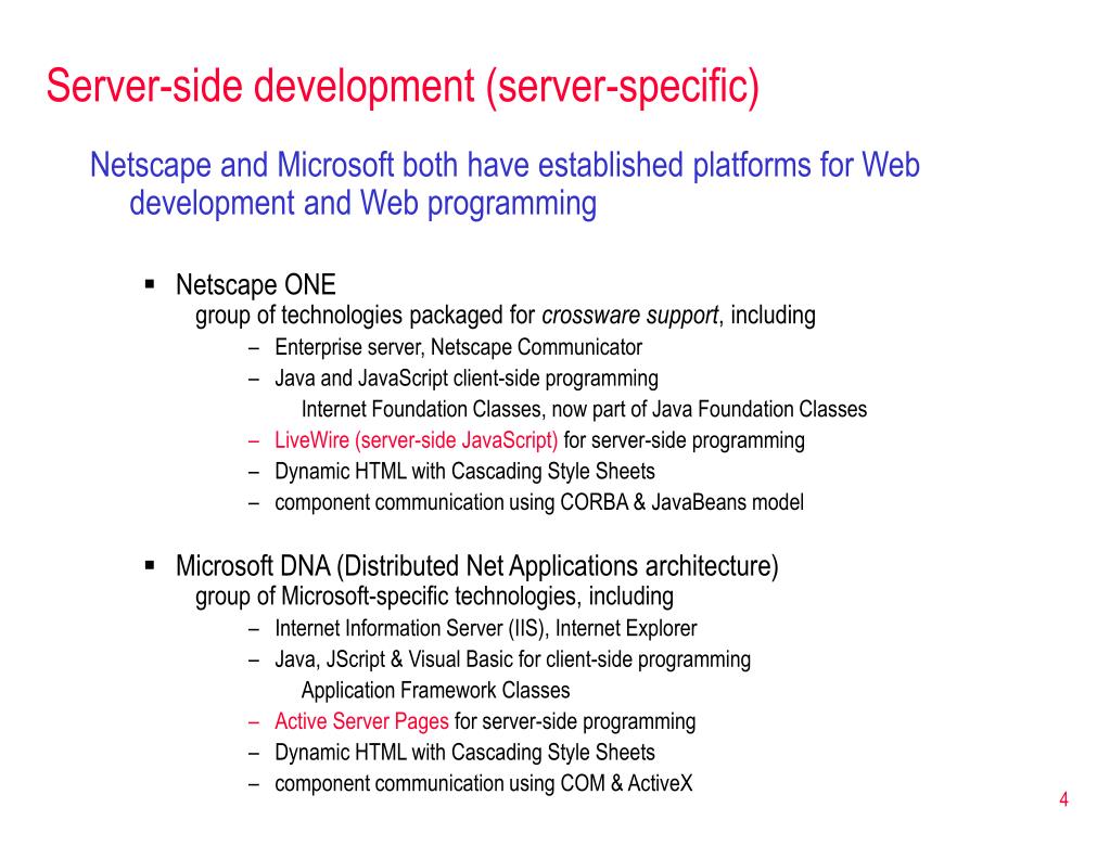 Server-side development (server-specific) • Netscape and Microsoft both have established platforms for Web development and Web programming • Netscape ONE • group of technologies packaged for crossware support, including • Enterprise server, Netscape Communicator • Java and JavaScript client-side programming Internet Foundation Classes, now part of Java Foundation Classes • LiveWire (server-side JavaScript) for server-side programming • Dynamic HTML with Cascading Style Sheets • component communication using CORBA & JavaBeans model • Microsoft DNA (Distributed Net Applications architecture) • group of Microsoft-specific technologies, including • Internet Information Server (IIS), Internet Explorer • Java, JScript & Visual Basic for client-side programming Application Framework Classes • Active Server Pages for server-side programming • Dynamic HTML with Cascading Style Sheets • component communication using COM & ActiveX