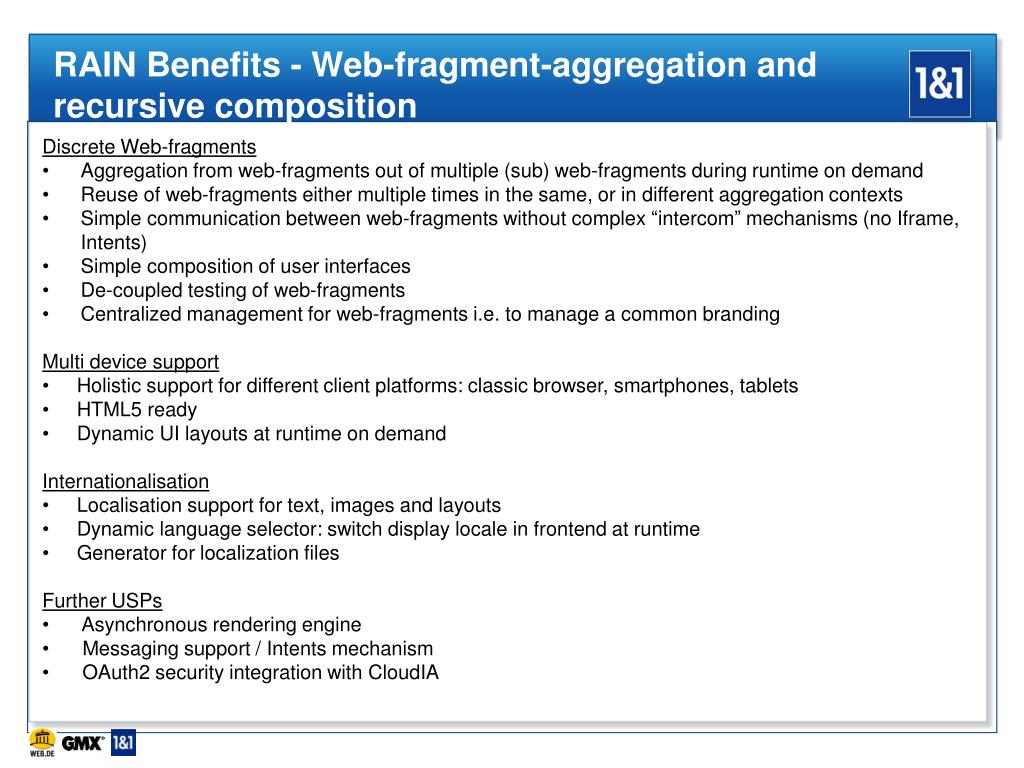 RAIN Benefits - Web-fragment-aggregation and recursive composition • Discrete Web-fragments • Aggregation from web-fragments out of multiple (sub) web-fragments during runtime on demand • Reuse of web-fragments either multiple times in the same, or in different aggregation contexts • Simple communication between web-fragments without complex “intercom” mechanisms (no Iframe, Intents) • Simple composition of user interfaces • De-coupled testing of web-fragments • Centralized management for web-fragments i.e. to manage a common branding • Multi device support • Holistic support for different client platforms: classic browser, smartphones, tablets • HTML5 ready • Dynamic UI layouts at runtime on demand • Internationalisation • Localisation support for text, images and layouts • Dynamic language selector: switch display locale in frontend at runtime • Generator for localization files • Further USPs • Asynchronousrenderingengine • Messaging support / Intentsmechanism • OAuth2 securityintegrationwithCloudIA